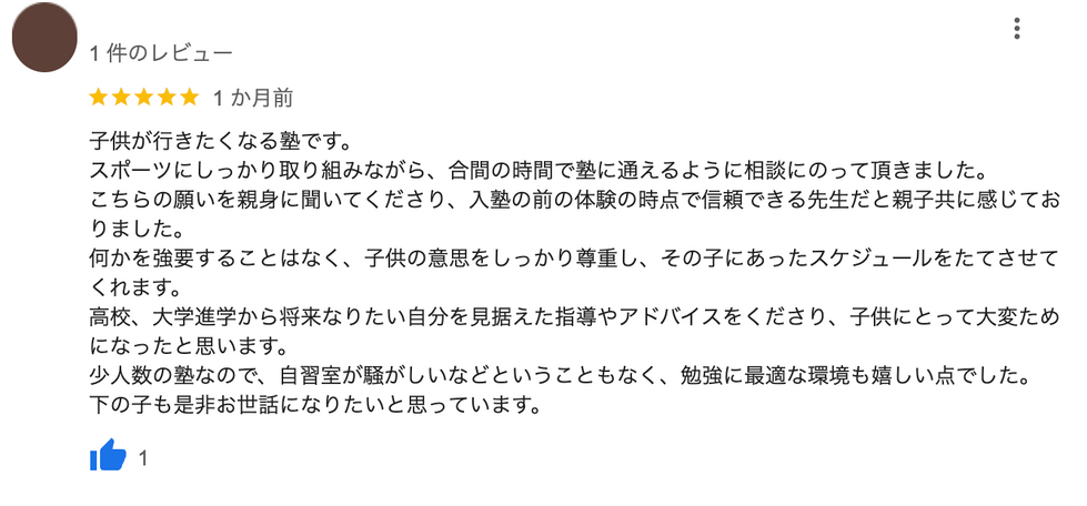 この塾のいいところは、楽しいところです。もちろん勉強もわかりやすく解説してくれます。和やかな雰囲気で、成績が上がるだけでなく、生徒の意見を一番に尊重してくれる塾です。